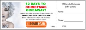 The Hair Hub, a small NSW haircare chain with two stores in Port Macquarie’s shopping centres, gave its customers a Christmas gift with their 12 Days to Christmas Giveaway, drawn on the 27th of December.